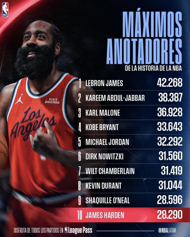 NBA歷史最新得分榜:詹姆斯無人可擋!哈登進前十 無庫里身影